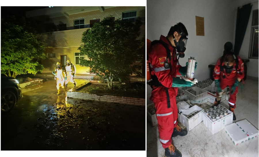 海利集團(tuán)救援隊(duì)于19日20時(shí)抵達(dá)現(xiàn)場(chǎng)后,全體隊(duì)員未作休整即刻投入救援。在快速完成化學(xué)防護(hù)服穿戴及空氣呼吸器佩戴的同時(shí),同步核查糧庫(kù)物資存儲(chǔ)信息。完成準(zhǔn)備工作后,救援組立即進(jìn)入倉(cāng)庫(kù)展開分工協(xié)作,對(duì)庫(kù)區(qū)空氣實(shí)施系統(tǒng)化檢測(cè)與偵查。經(jīng)全面排查潛在風(fēng)險(xiǎn)點(diǎn),確認(rèn)除磷化鋁瓶體表面存在大量淤泥附著外,其包裝內(nèi)部未發(fā)現(xiàn)進(jìn)水跡象。